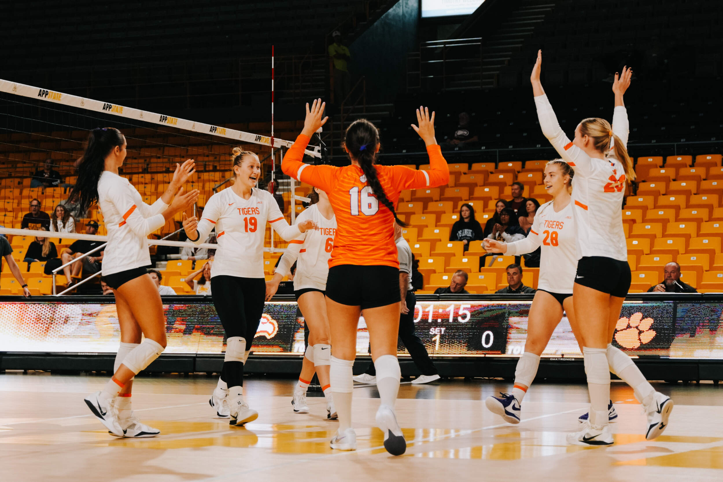The Tigers entered the final match up the weekend with early scoring runs coming from Taylor and Joki clocking aces and kills. Clemson was also able to take advantage of attack errors by the Eagles, while Kennedy Wagner, Young and Hansen added kills to keep Clemson on pace. The Tigers never conceded the lead as they went on a 7-3 run to win the opening set, 25-19.