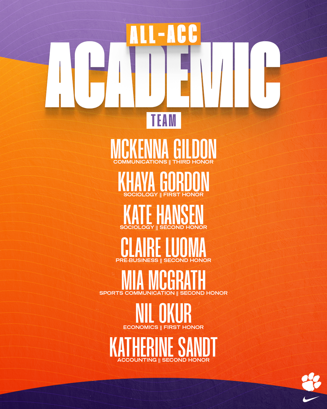 Additional two-time honorees include 2025 starters Hansen (Weatherford, Texas), McGrath (Deerfield, Ill.) and Sandt (Western Springs, Ill.). Hansen finished her the year with 242 kills, 86 blocks and 17 aces while working towards a degree in sociology. McGrath, who is getting a degree in sports communications, rounded out her Clemson career in 2025 with a team-high 336 kills and added her name to the 1,000-career point mark. Sandt concluded her redshirt sophomore season as the starting setter that contributed 1,098 assists and a team-high 31 aces while working towards a degree in accounting.