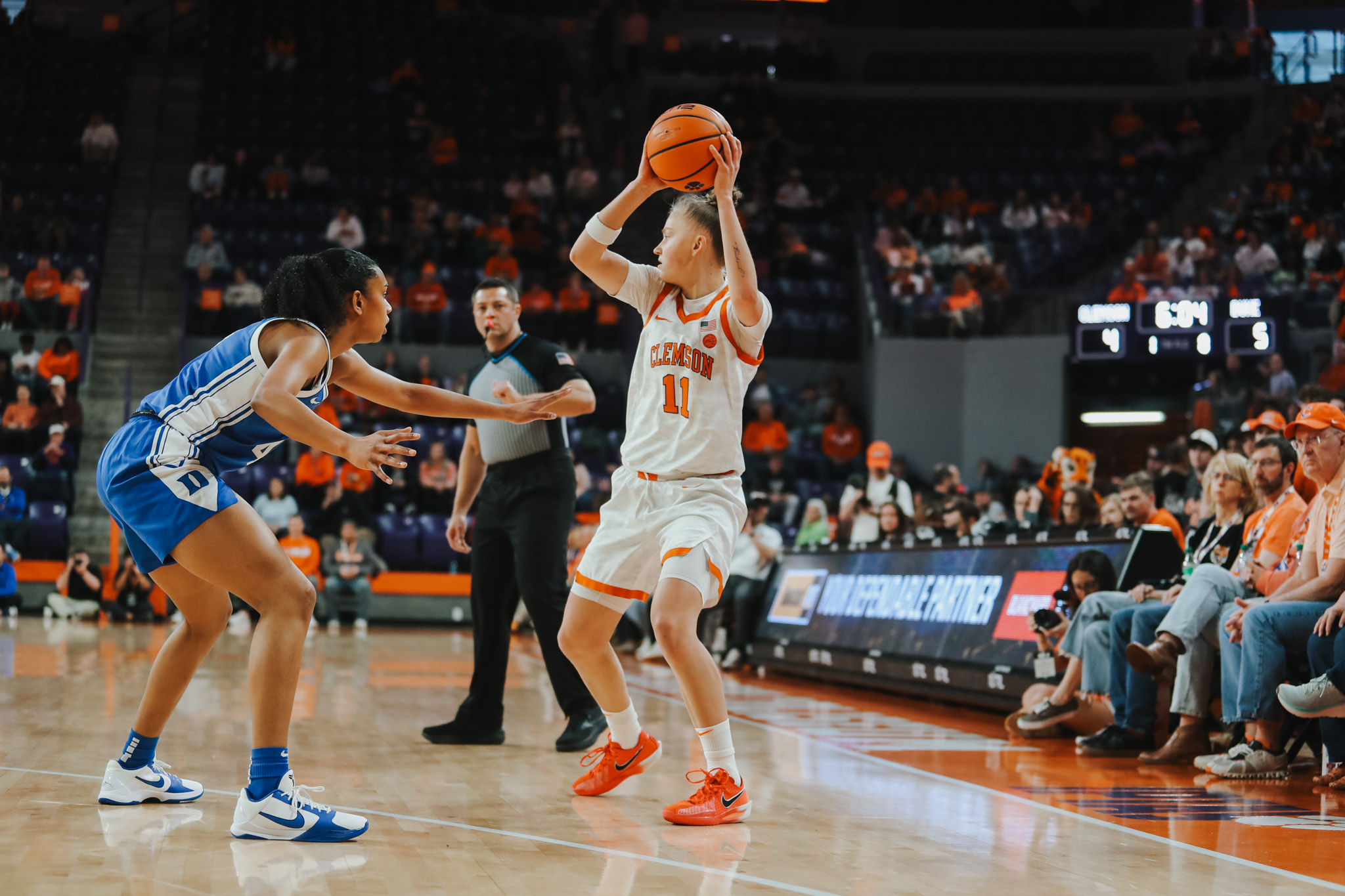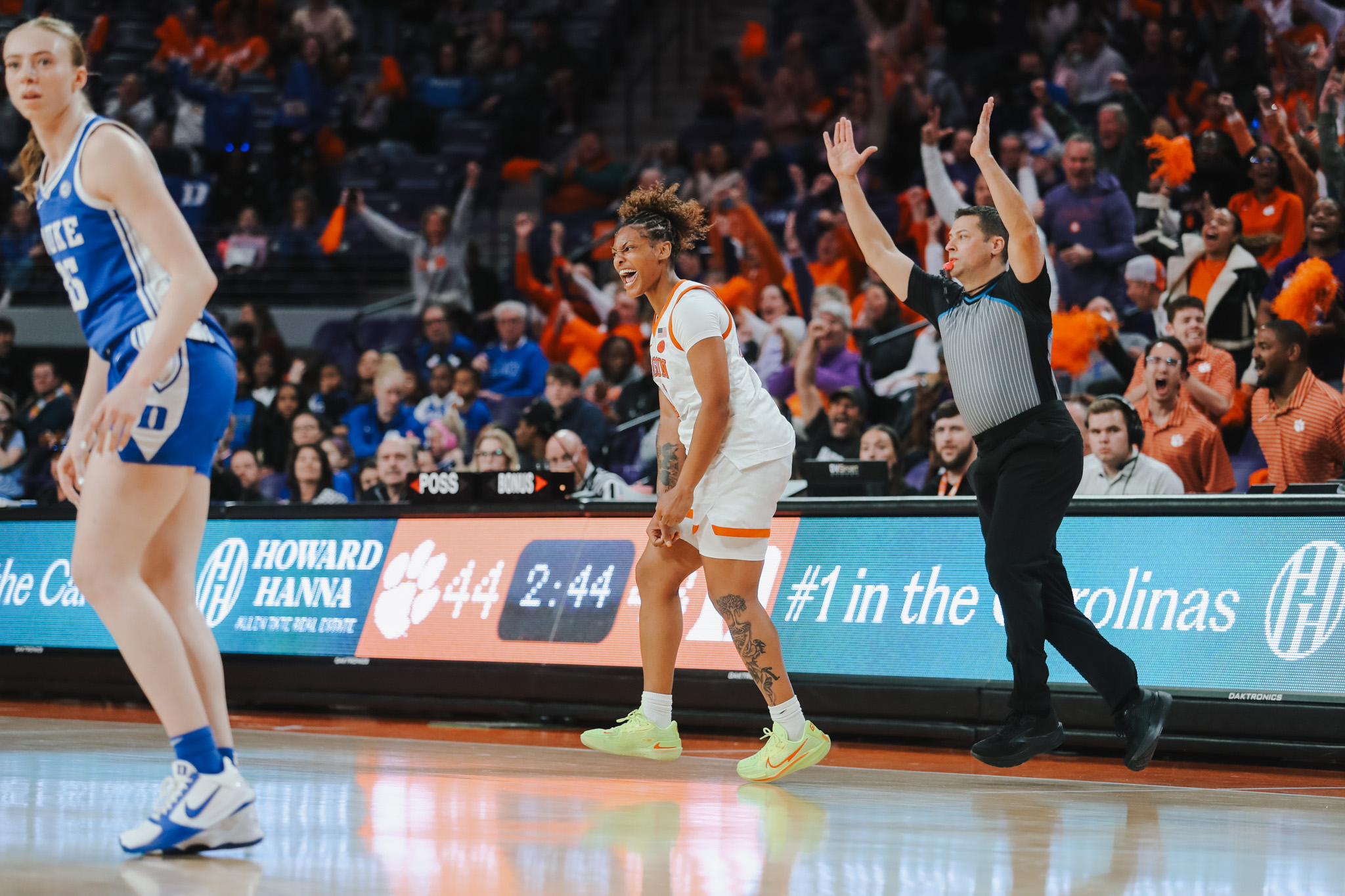 The Tigers found themselves in a hole early, as Duke rattled off a 22-4 lead after Clemson scored the game’s first four points. A 12-point Duke lead was trimmed to six at halftime, but the Blue Devils outscored the Tigers 10-7 in the third, and Clemson headed into the final quarter trailing 39-30. In the fourth quarter, the Tigers clawed back and got themselves in striking distance down only two with 3:50 remaining. An and-one from Moore gave Clemson its first lead of the day going up 44-43 with 3:25 left in the game, and Johnson-Matthews nailed a three-pointer to stretch the lead to four and punctuate a 17-4 run. The two teams would trade baskets through the next three minutes and Clemson found themselves down one with just 9.5 seconds remaining. Moore caught the pass on the inbounds and drove down the lane to draw an extra defender. In the chaos, the Blue Devil defense lost Kohn, who popped out to the top of the key, caught the pass from Moore, and buried the dagger with 3.1 seconds remaining. A tipped pass from Johnson-Matthews drained the last three seconds off the clock and didn’t allow Duke to get up a last shot. Thanks to the Tigers outscoring the Blue Devils 23-12 in the fourth quarter and clutch plays from Moore, Kohn and Johnson-Matthews, Clemson secured its first ranked win of the season, downing the Blue Devils 53-51.