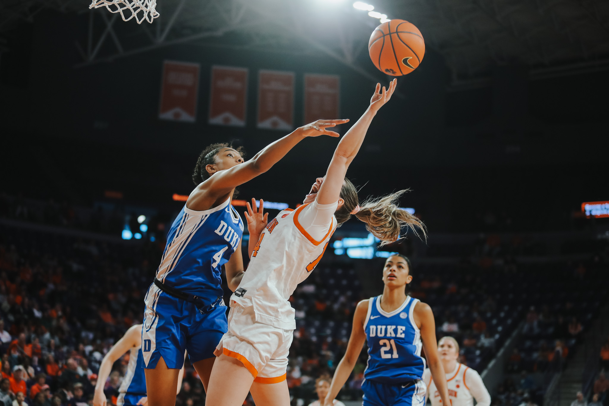 The Tigers were led on offense by graduate forward Demeara Hinds, who overcame two fouls in the first quarter to score 13 points (4-5 FG, 5-6 FT) and grab eight rebounds, three of which came on the offensive glass and led to four second-chance points. Senior guard Mia Moore had 11 points and six assists, including the and-one that gave the Tigers their first lead of the game with 3:25 in the final frame, and led the team in both assists (six) and steals (three). Johnson-Matthews had 11 points of her own to go along with seven rebounds and two assists. Senior center Morgan Lee made her first three-pointer of the season to end a 22-4 Blue Devil run in the second quarter and scored a season-high five points.