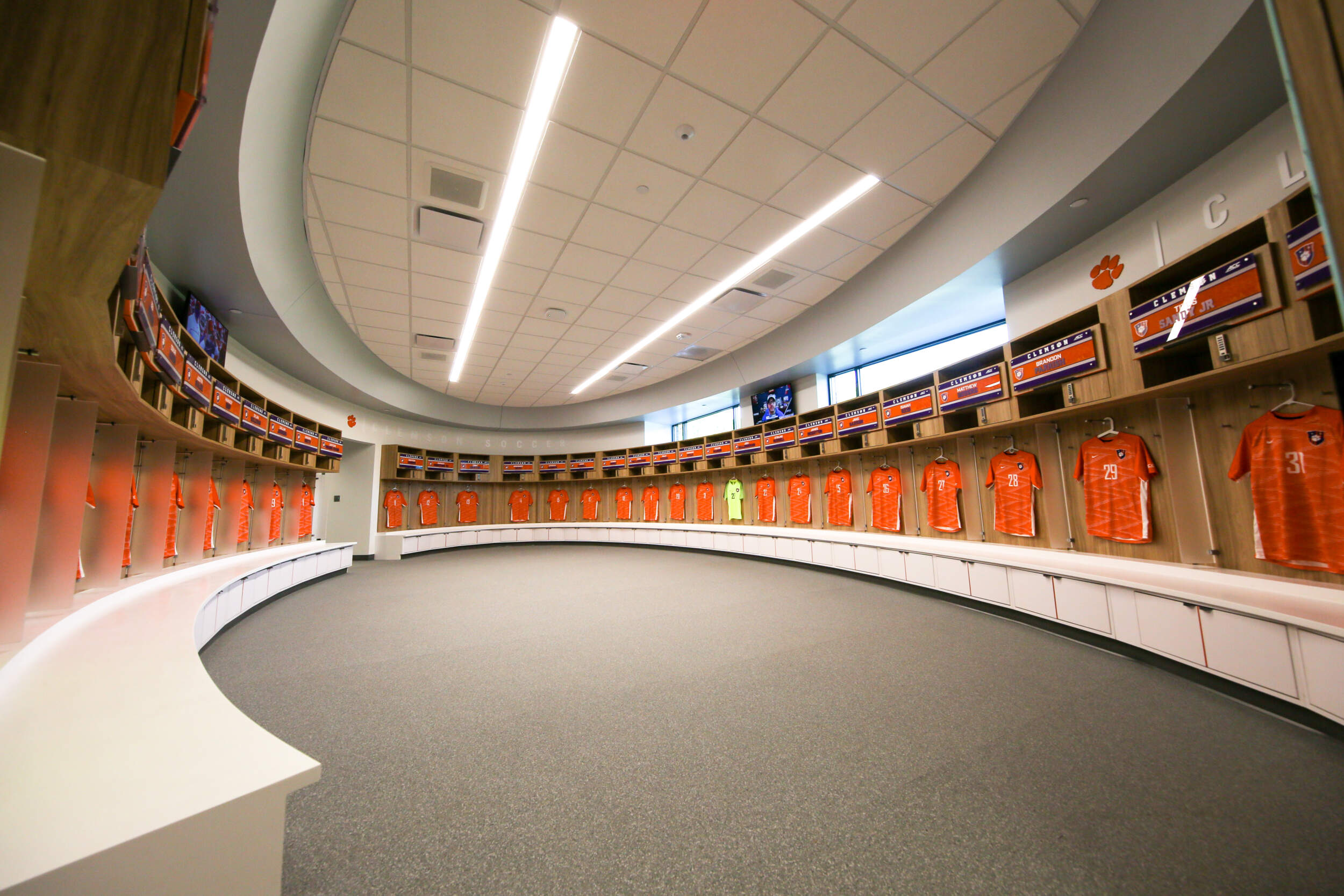 In early 2020, Clemson opened its new Soccer Operations Complex, one of the nation’s finest college soccer-specific facilities.  Located next to the soccer practice fields, the Soccer Operations Complex provides approximately 13,000 square feet of space and two full soccer fields, with dimensions of 360 feet x 225 feet. The facility also includes locker rooms, lounges, indoor and outdoor entertainment space, dedicated meeting/film room and a dedicated training room.