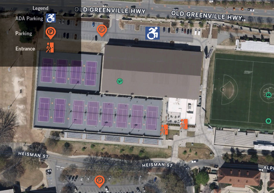 Duckworth Family Tennis Facility is located at Old Greenville Hwy, Clemson, SC 29634. There is one entrance to each of the seating areas to the southwest of the facility facing lot E-5. Full Stadium Map can be viewed here.