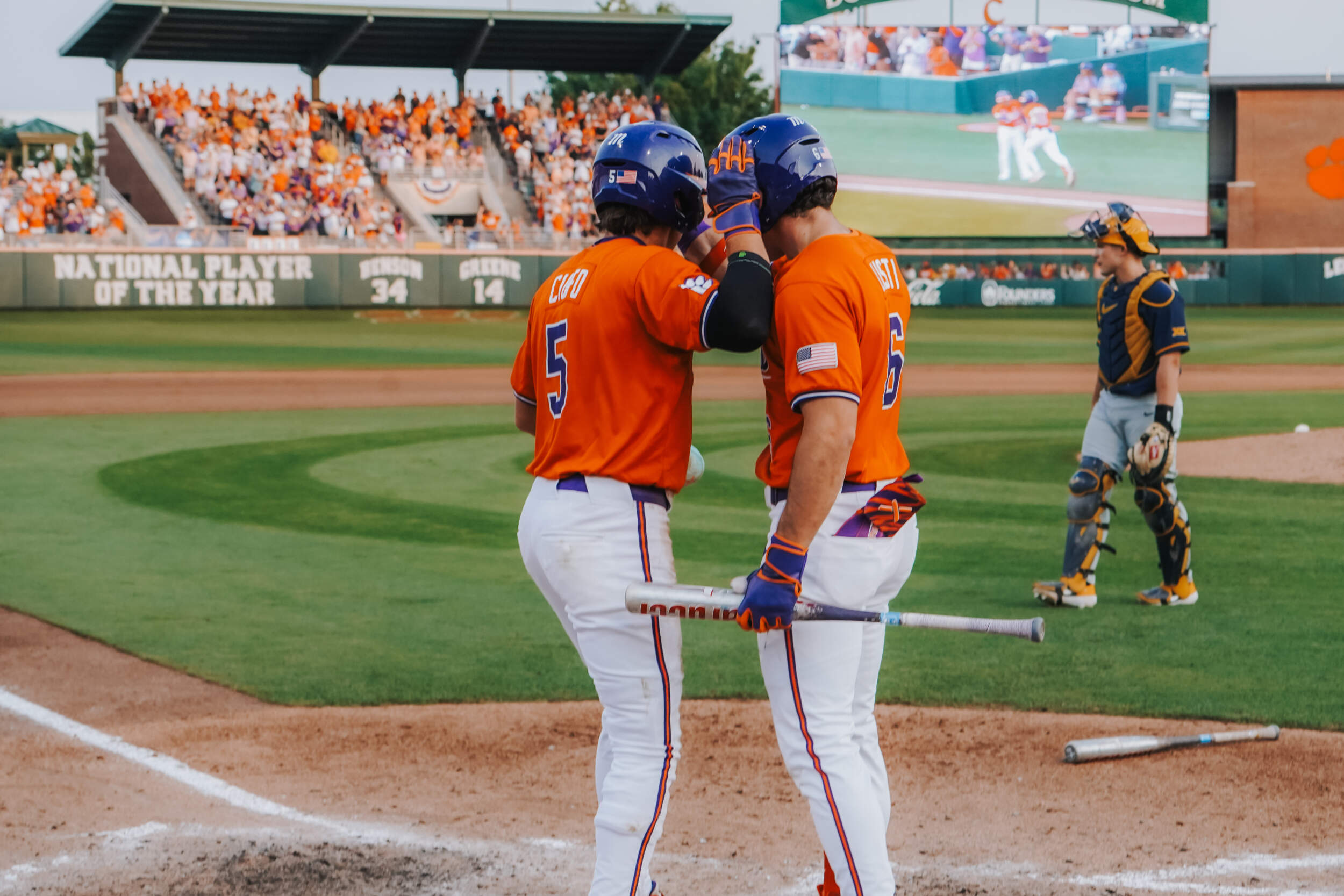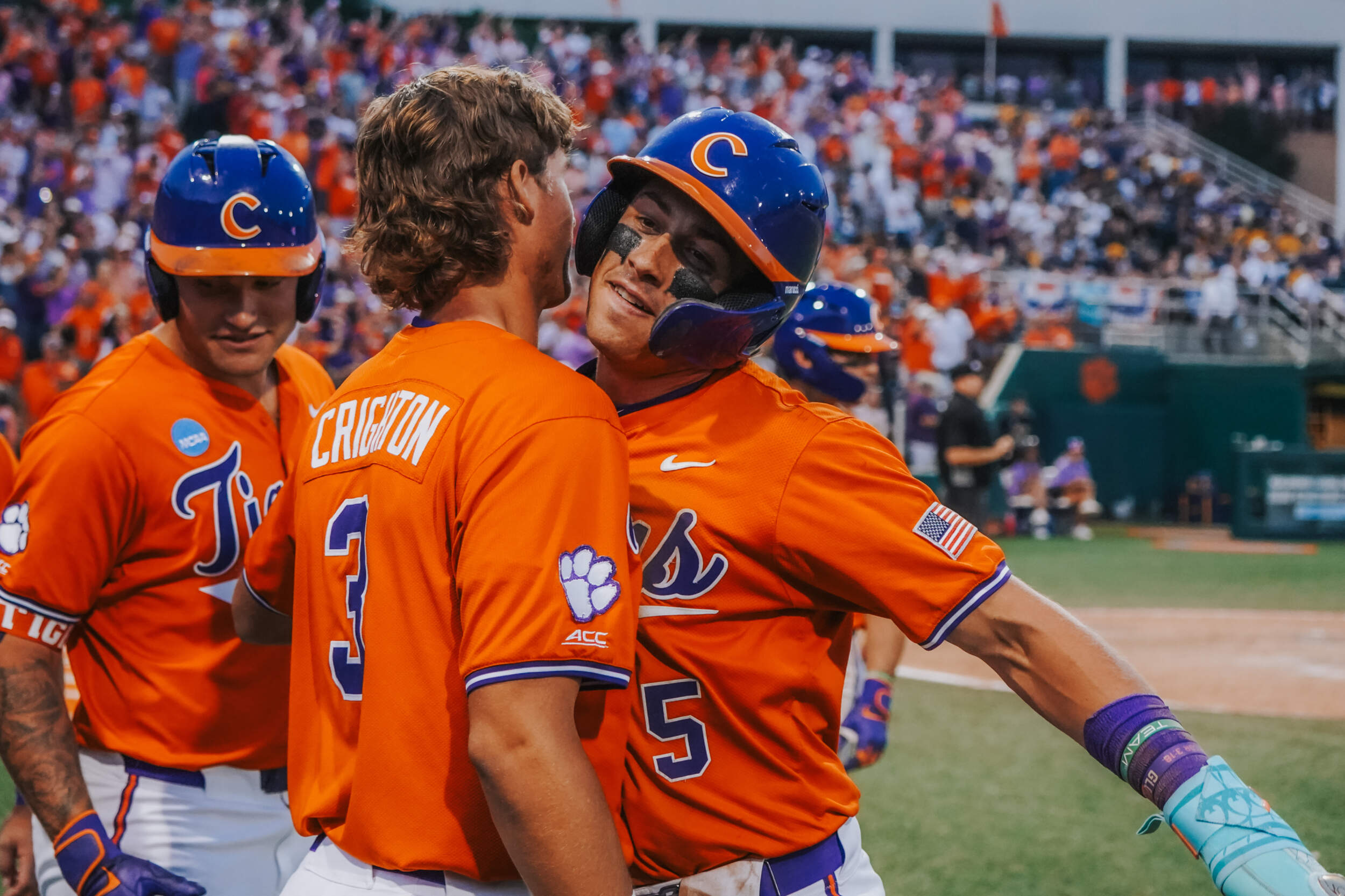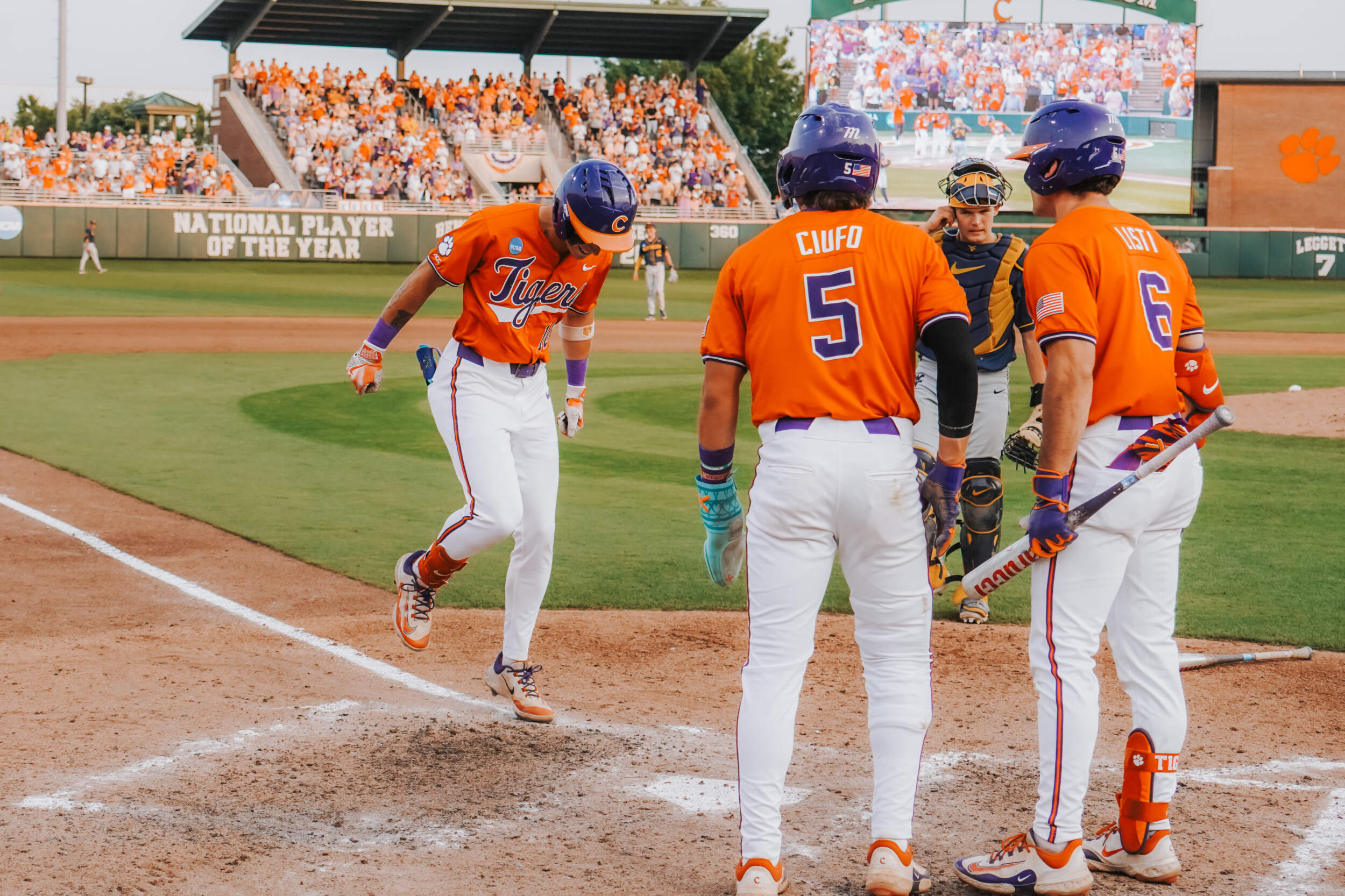 In the sixth inning, Cam Cannarella, who earlier extended his hitting streak to 21 games, laced a two-run homer, his fifth of the year, then Jack Crighton belted a run-scoring double. Jacob Jarrell followed with a sacrifice fly to tie the score 4-4. Cannarella gave Clemson the lead in the seventh inning with a run-scoring double. Dominic Listi extended his hitting streak to 11 games with a single later in the frame.