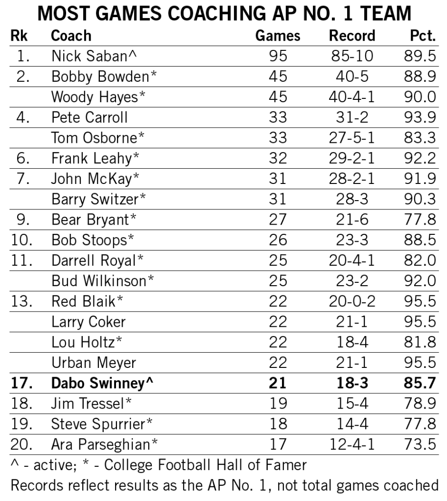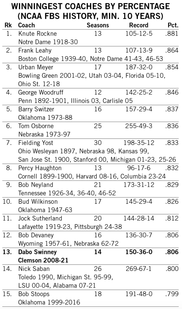 Swinney became the sixth-fastest FBS coach to 150 career wins — two games behind Fielding Yost and Joe Paterno — and the fourth-fastest in the modern era.