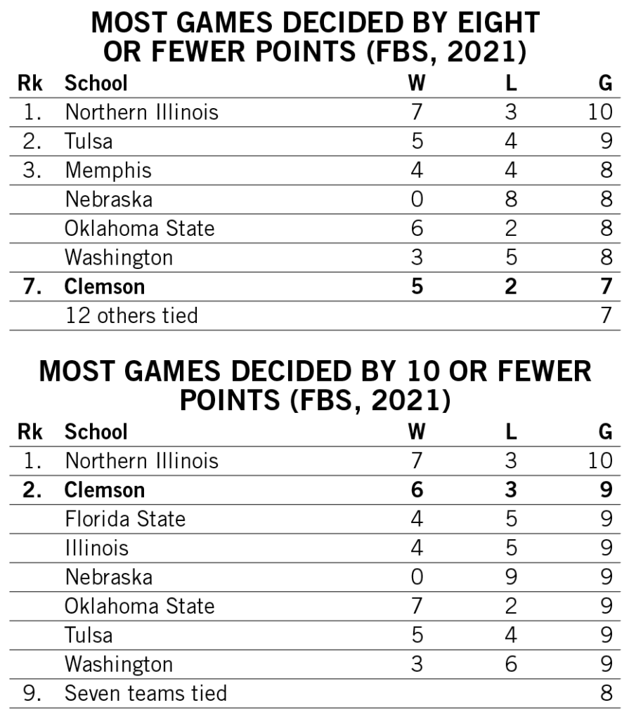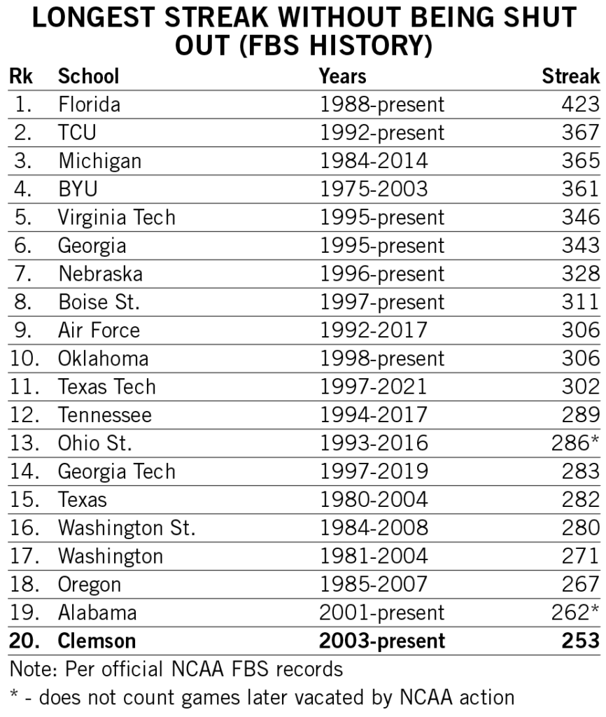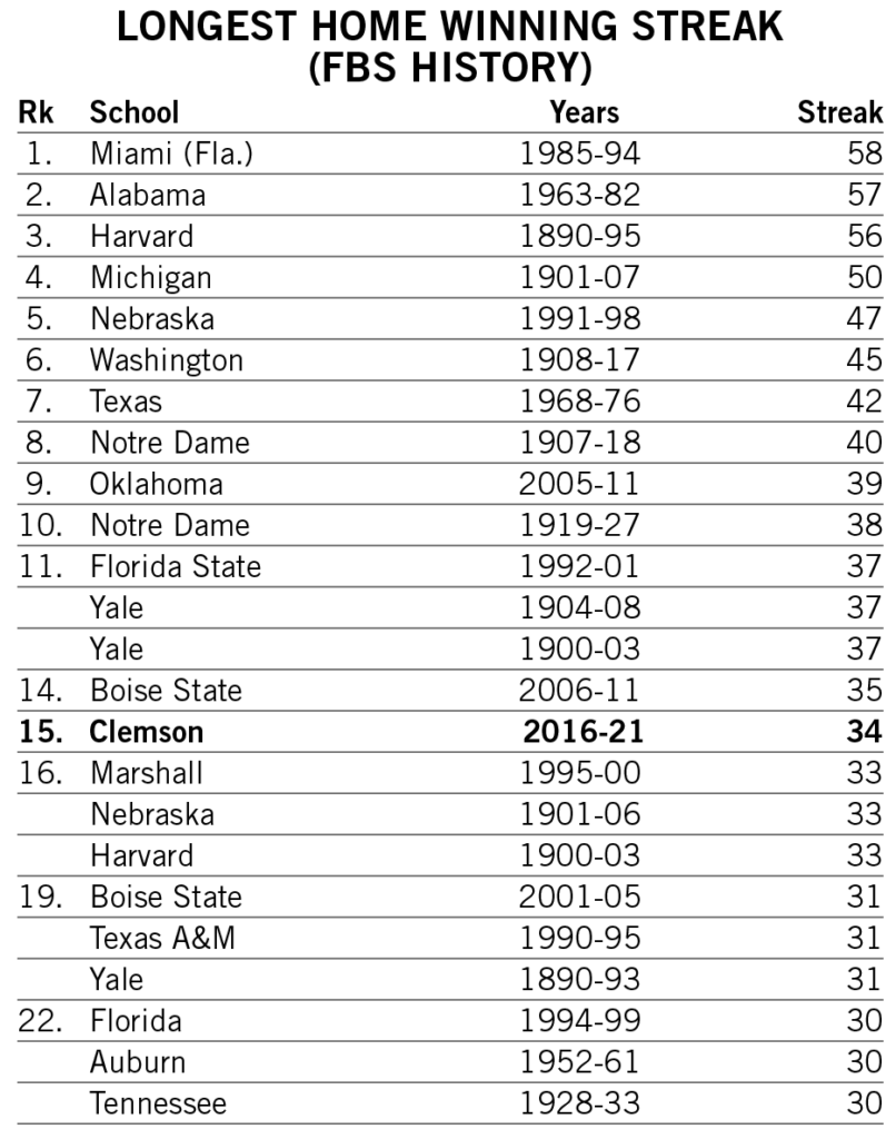 Four previous Clemson head coaches earned 150+ FBS wins in their careers: John Heisman (186), Jess Neely (207), Frank Howard (165) and Ken Hatfield (168). Howard, a College Football Hall of Famer, is the only coach to reach 150 career wins as Clemson’s head coach. He recorded his 150th victory in his 273rd career game, in a 14-10 victory against Maryland in 1966 that clinched a piece of what later became an outright ACC title. Heisman earned win No. 150 in game No. 203, Neely earned it in game No. 268, and Hatfield did it in game 259, though none of those three won more than 43 games in their Clemson tenures.