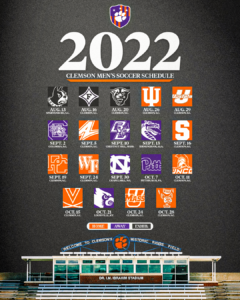 CLEMSON, S.C. – Head Coach Mike Noonan and the defending National Champion Clemson men’s soccer team announced the 2022 season schedule on Wednesday. The schedule features eight ACC matches, and is highlighted by the season opener at Historic Riggs Field against Indiana on August 26.