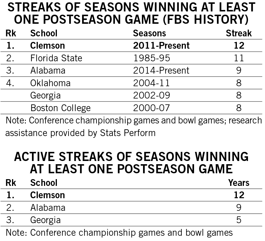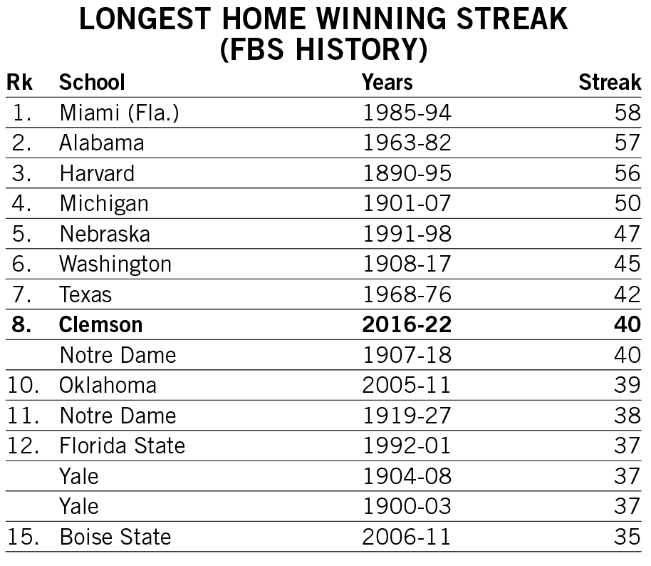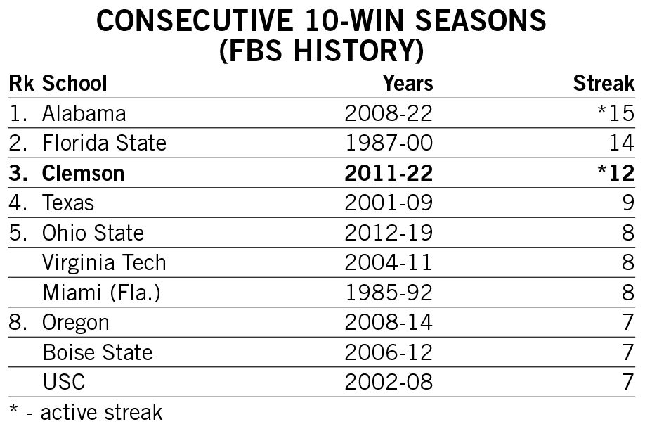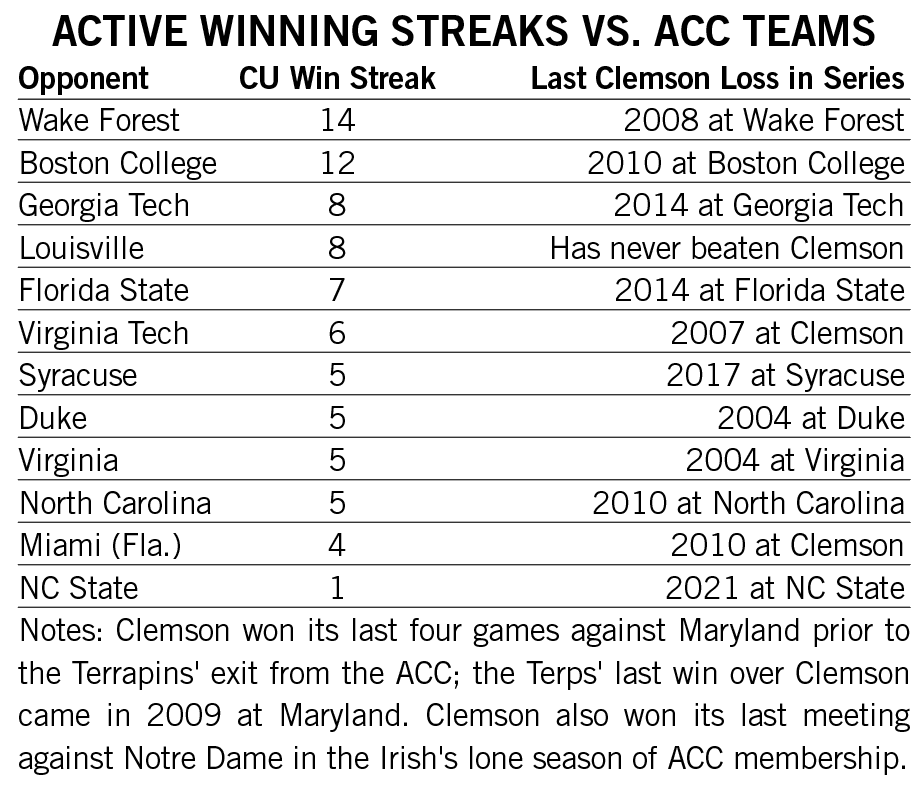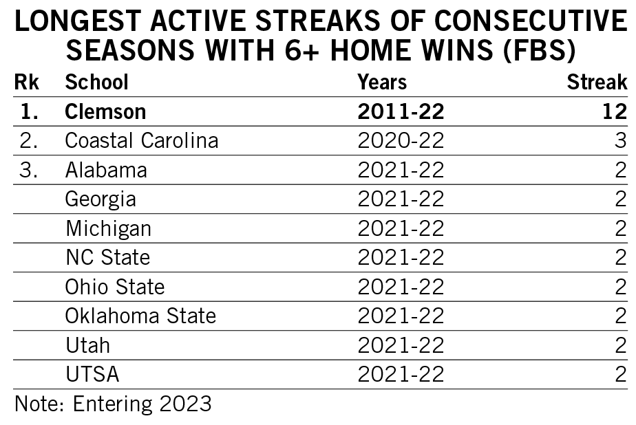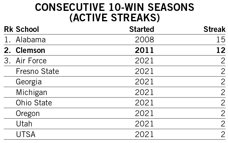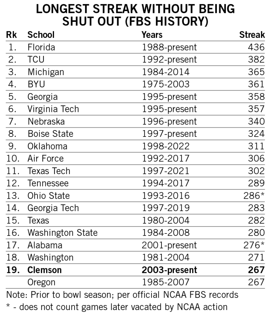 Shipley scored a rushing touchdown in seven straight games across the 2021-22 seasons and then rattled off another six-game streak late in 2022. He is responsible for two of the 12 longest streaks of games with a rushing touchdown in Clemson history.