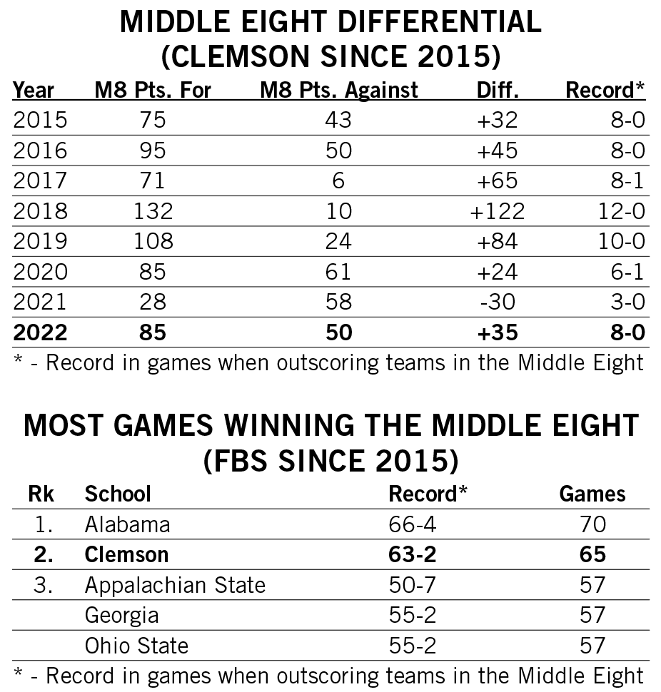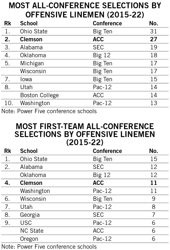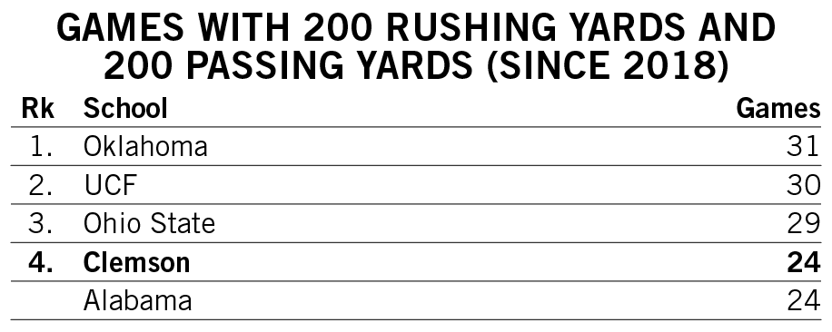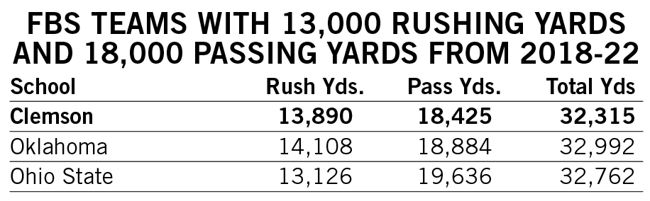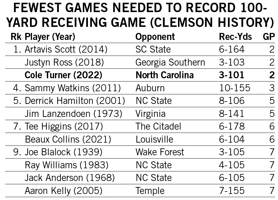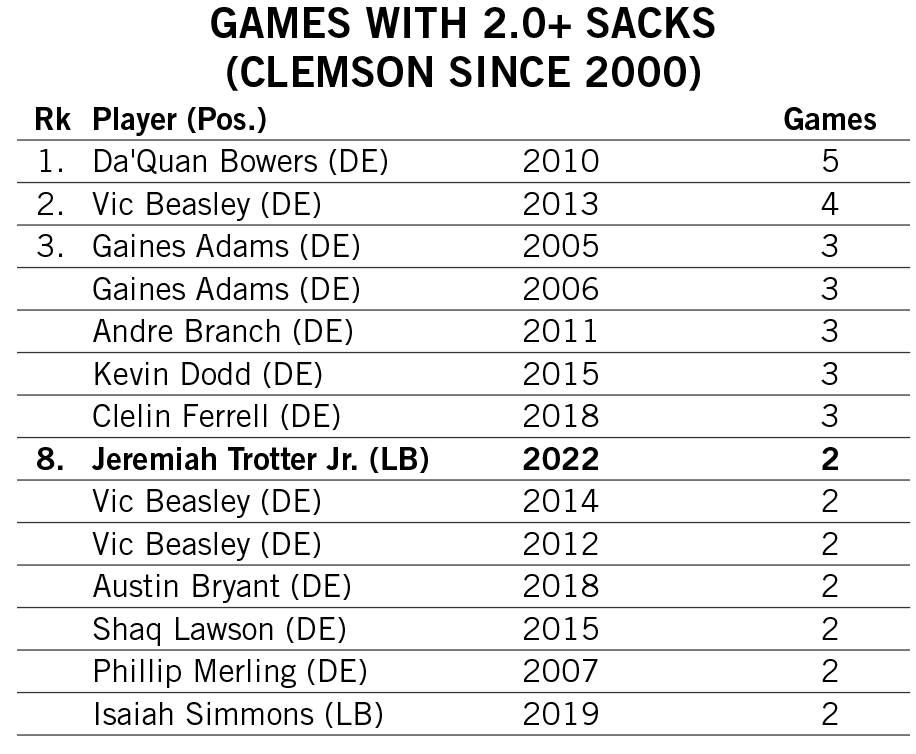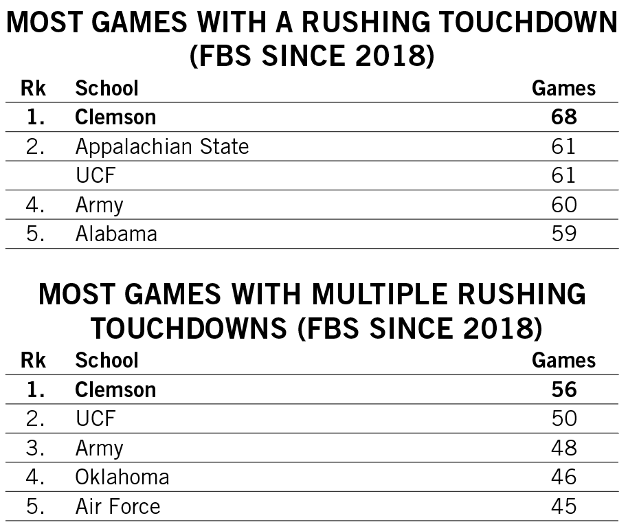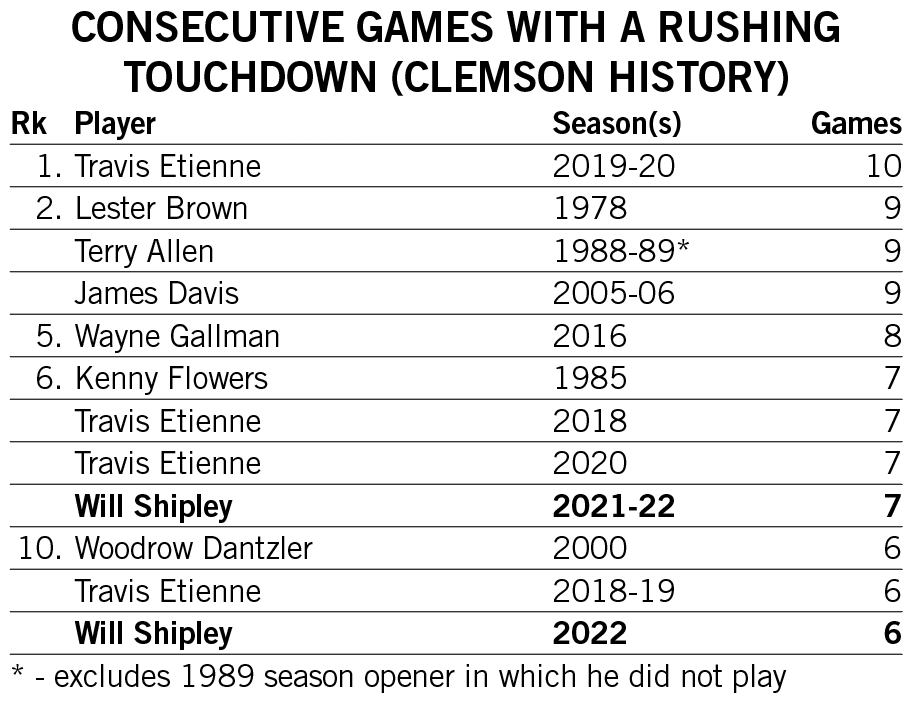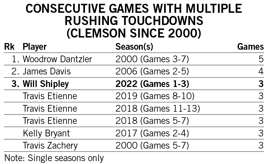 Shipley’s streak of three consecutive games with multiple rushing touchdowns over the first three games of the 2022 season tied for Clemson’s third-longest since 2000.