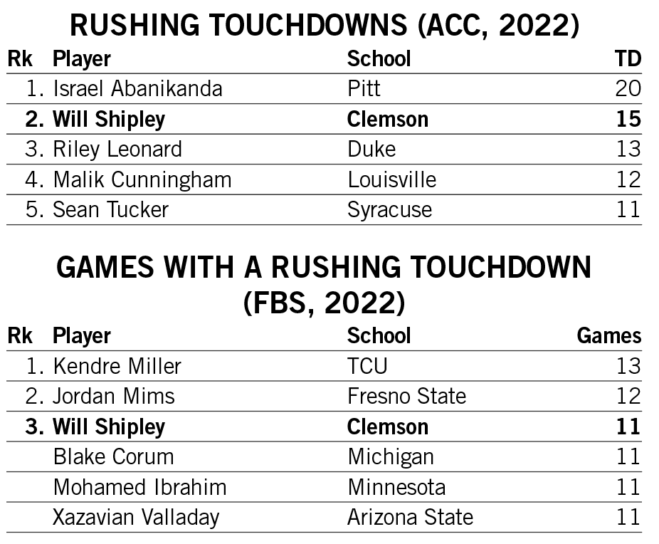 Will Shipley ranked second in the ACC and among the top 15 in the nation in rushing touchdowns in 2022. His consistency made him one of only six players nationally rush for a touchdown in at least 11 different games in 2022.