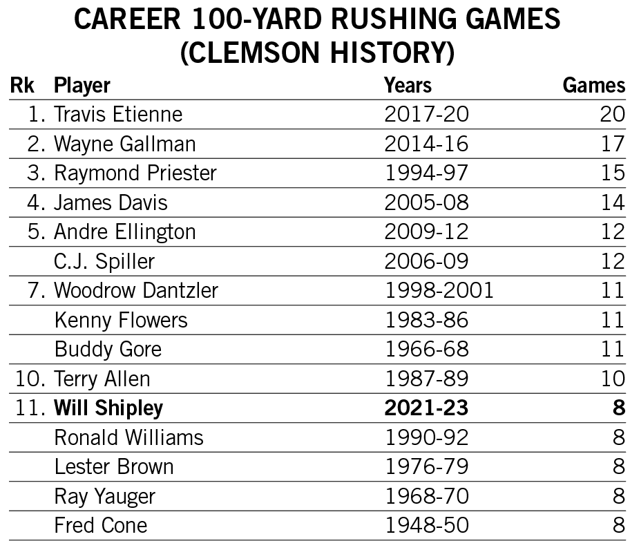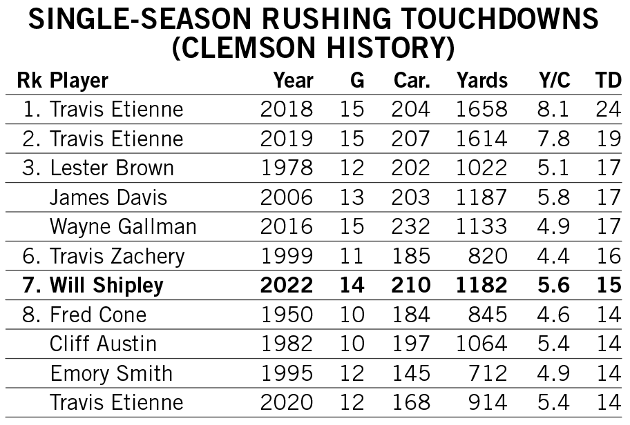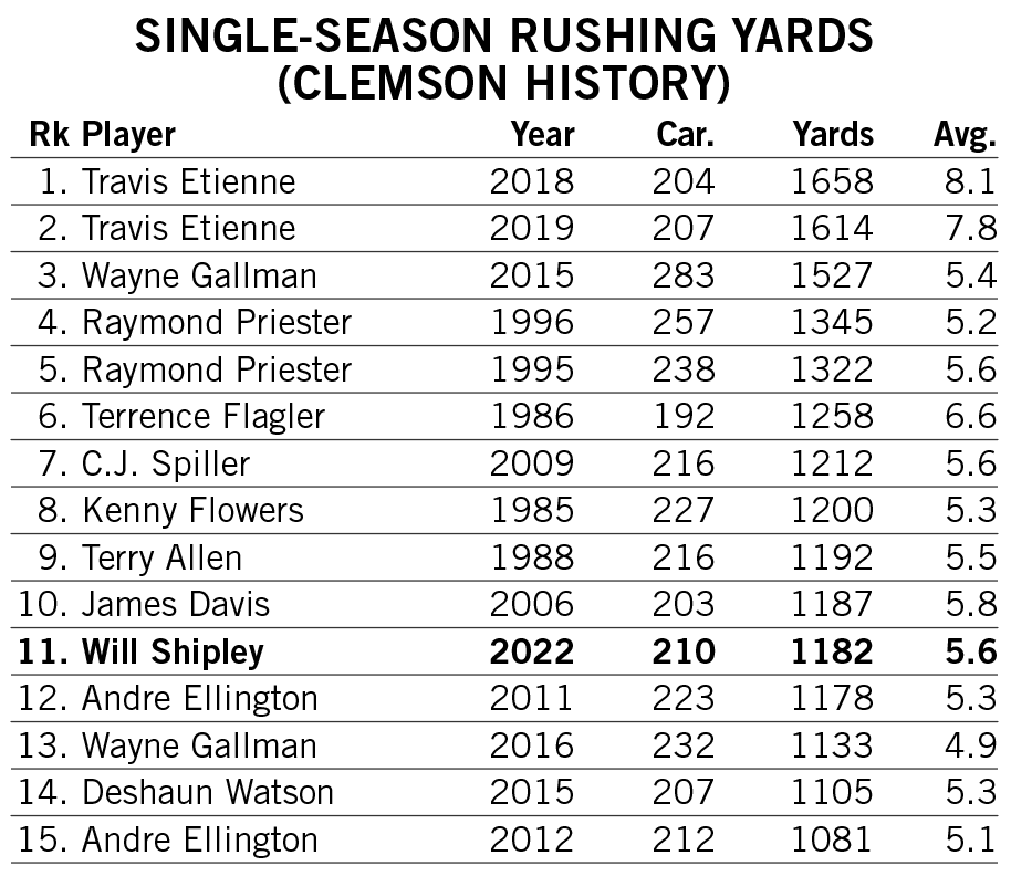 Shipley produced the 23rd 1,000-yard rushing season in school history in 2022, finishing the year seventh in single-season rushing touchdowns and 11th in single-season rushing yards in Clemson annals.
