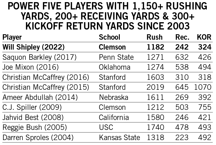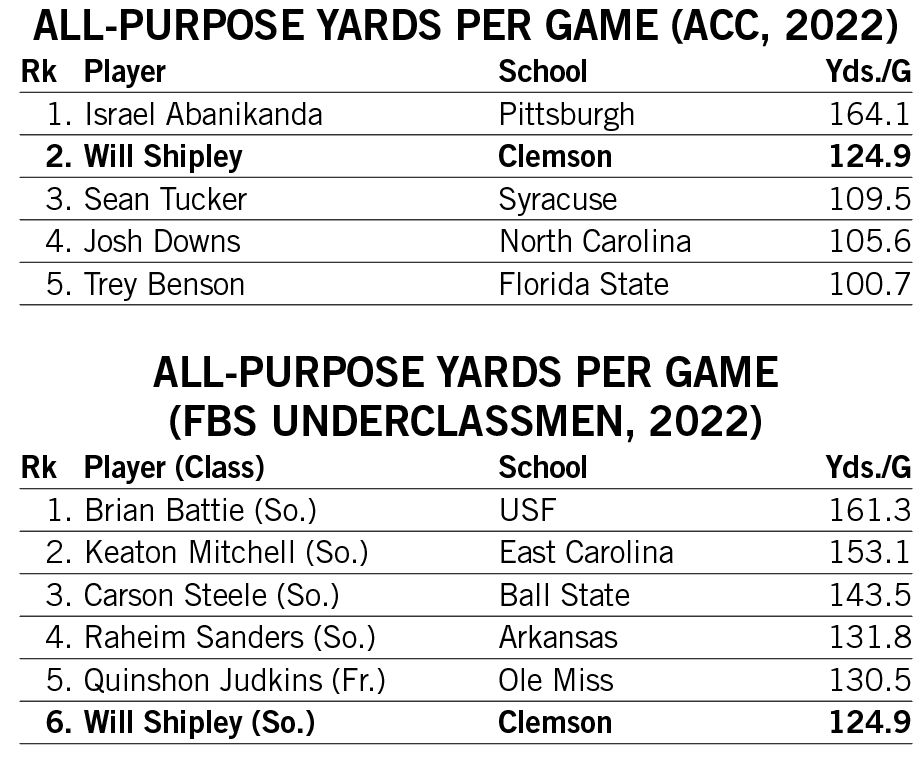With 1,748 all-purpose yards in 2022, Shipley ranked ninth in Clemson history in all-purpose yardage in a single season.