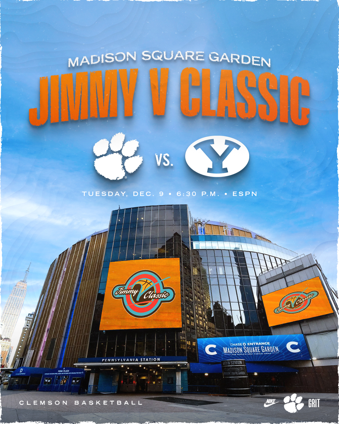 CLEMSON, S.C. — Clemson University men’s basketball and Brigham Young University will play on Tuesday, Dec. 9 in Madison Square Garden in New York City in the 2025 Jimmy V Classic. The game time is 6:30 p.m. and will air on ESPN.