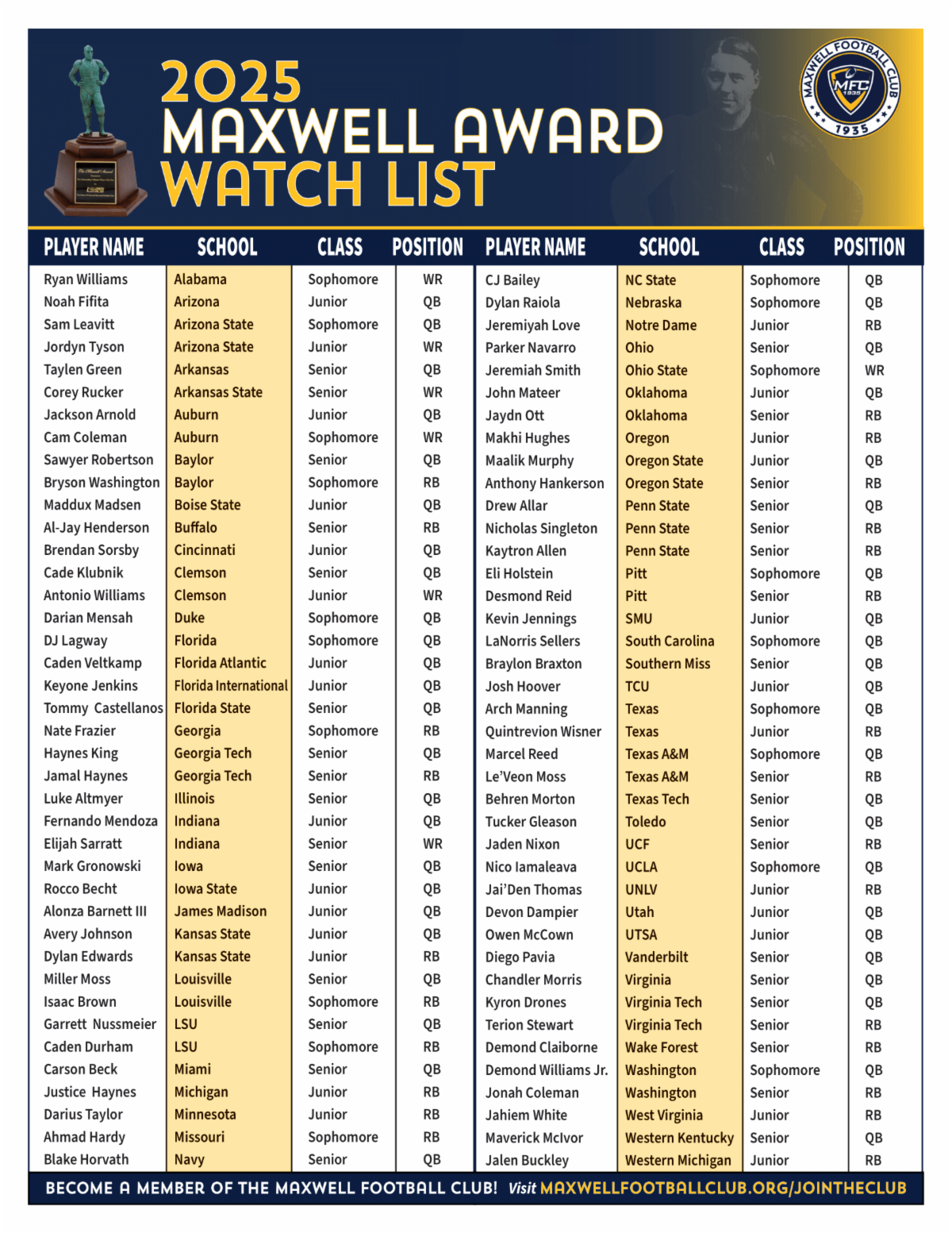 Questions concerning the 2025 Maxwell watch list can be directed to MFC Executive Director Mark Wolpert mwolpert@maxwellfootballclub.org or MFC Vice President of College Awards Rich Cirminiello rcirminiello@maxwellfootballclub.org.