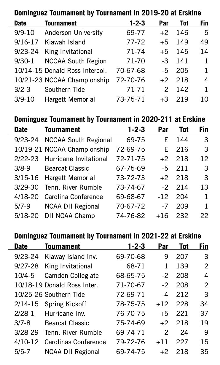 2021-22 at Erskine: Posted a 71.88 stroke average as a junior in 11 tournaments and 32 rounds…had career best 10 rounds in the 60s, he shot 75 or better in 28 of the 32 rounds…had 14 under-par rounds and 17 at par or better…had career best 65 in second round of Camden Collegiate and season best 207 score for 54 holes at the Kiawah Island Invitational to start the season….in fall of 2021, had five top five finishes and 13 of his 14 rounds were at 72 or better…finished second at the King Invitational and the Donald Ross Intercollegiate, he was third at the Kiawah Island Invitational and the Southern Tide…finished fourth at Camden Collegiate…in the spring, finished ninth at the Tennessee River Rumble, 15th at the Carolinas Conference Championship and 35th at the NCAA Southeast Regional…had at least one round in the 60s in seven of his 11 tournaments…earned third-team All-America honors from the Golf Coaches Association, he was all-regional and all-conference…finished fifth at Spanish Amateur….had rounds of 73-71 at the British Amateur, but did not make match play.