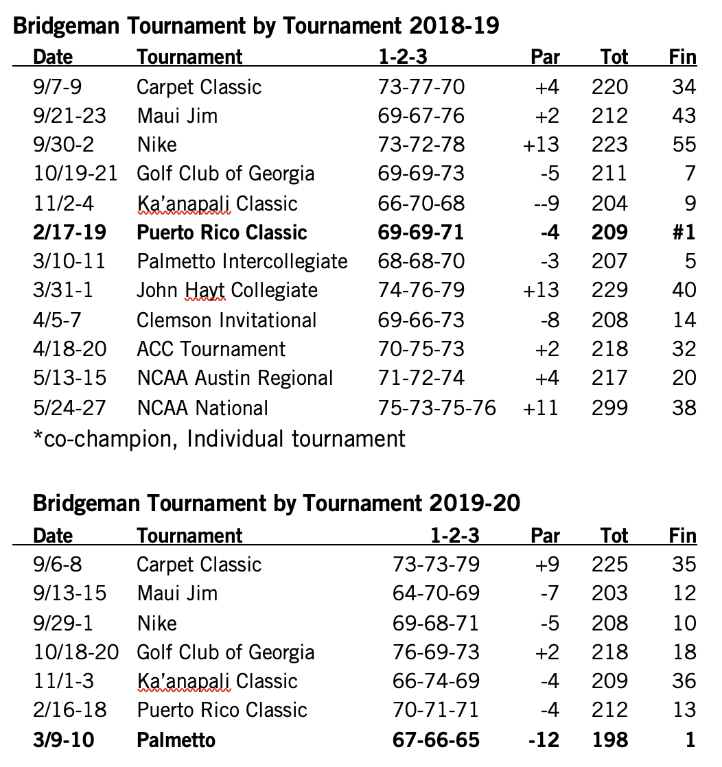 In High School: Bridgeman was a second-team AJGA All-American, the first Clemson signee to make a first or second-team AJGA All-American team since Billy Kennerly in 2011…. won his three state championships by six, five and nine shots as a sophomore, junior and senior, respectively…won Spartanburg County, Region 3A, Upper State and 3A State Championships as a junior and senior…won The Blade, Grand Bennett Junior, Jimmy Self Junior and Beth Daniels Junior Azalea….in summer of 2018 finished tied for ninth at National Junior Amateur, fourth at the Trans-Mississippi Amateur, ninth at the Azalea Amateur, 36th at North-South Amateur in Pinehurst…posted a 70.8 stroke average as a junior….played his high school golf for Dustin Batson….majoring in mathematical sciences as Clemson, same major Doc Redman had at Clemson….born 12-6-99.