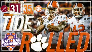 Deshaun Watson’s touchdown pass to Hunter Renfrow with one second left sealed one of the greatest National Championship battles in history, with Clemson winning its second crown ever after a 35-31 defeat of No. 1 Alabama. It was the first win in program history over the nation’s top-ranked team.